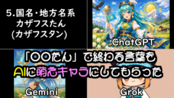 「○○たん」で終わる言葉をAIに萌えキャラにしてもらいました。ChatGPT、Gemini、Grokの順番で並べてます。今回得られた知見としては、同じチャット内で画像を生成していると、直前に生成した画像を参照してしまうので、新しいチャットを...