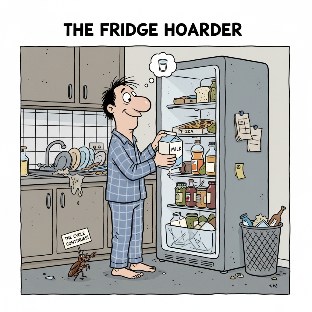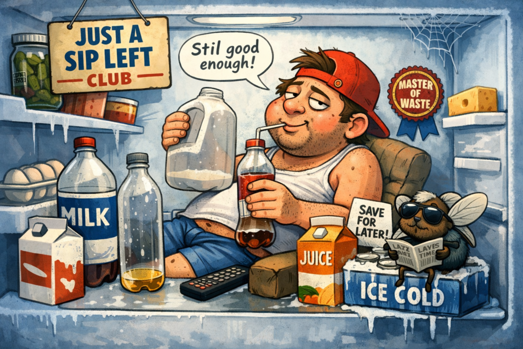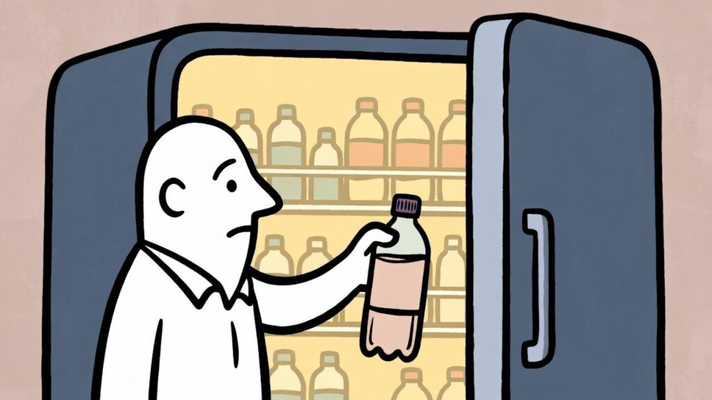 ほぼ空の飲み物冷蔵庫に戻すマン