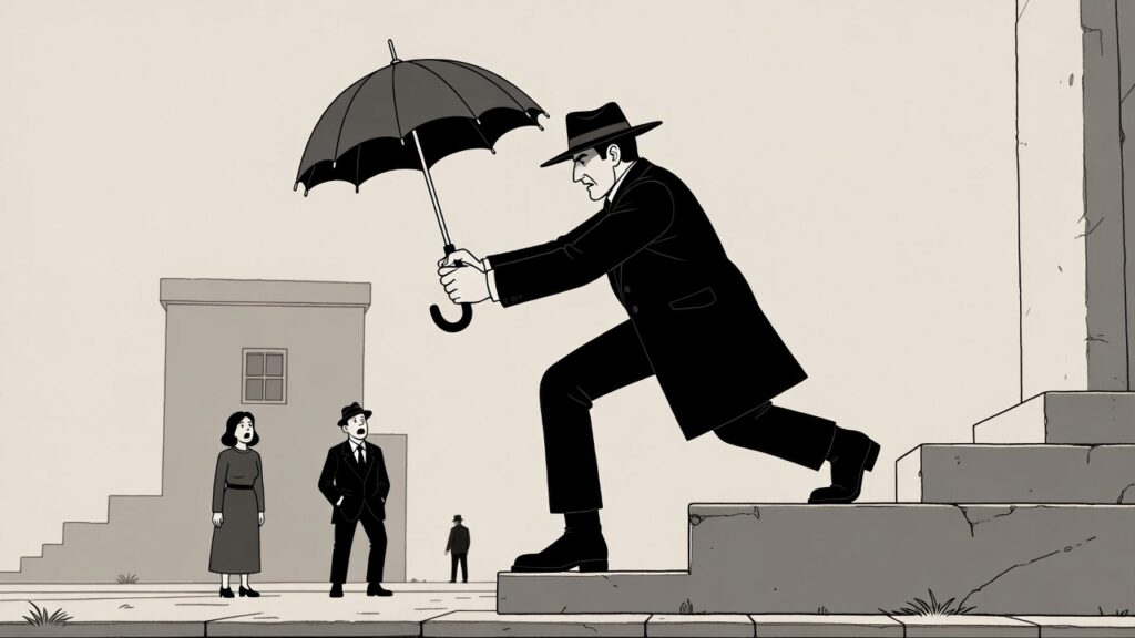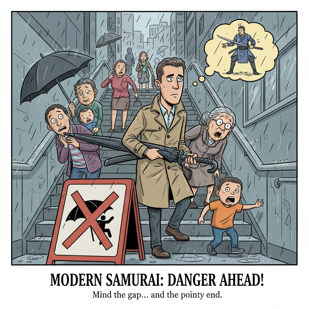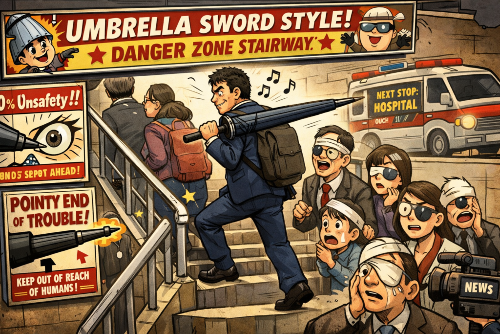階段で傘を刀みたいに持つマン