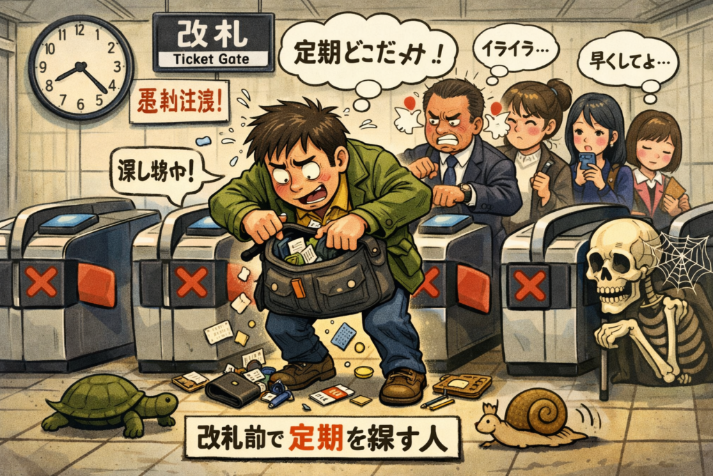 改札の目の前で定期探し始めるマン