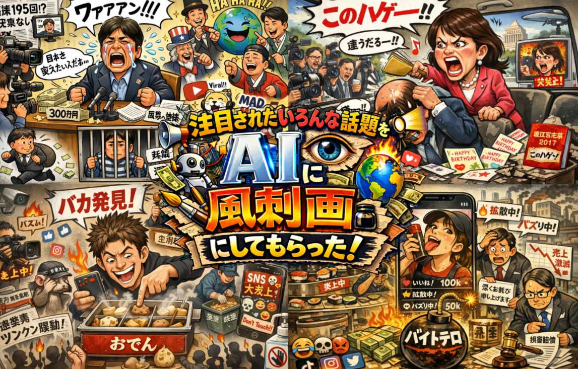 注目されたいろんな話題をAIに風刺画にしてもらいました。