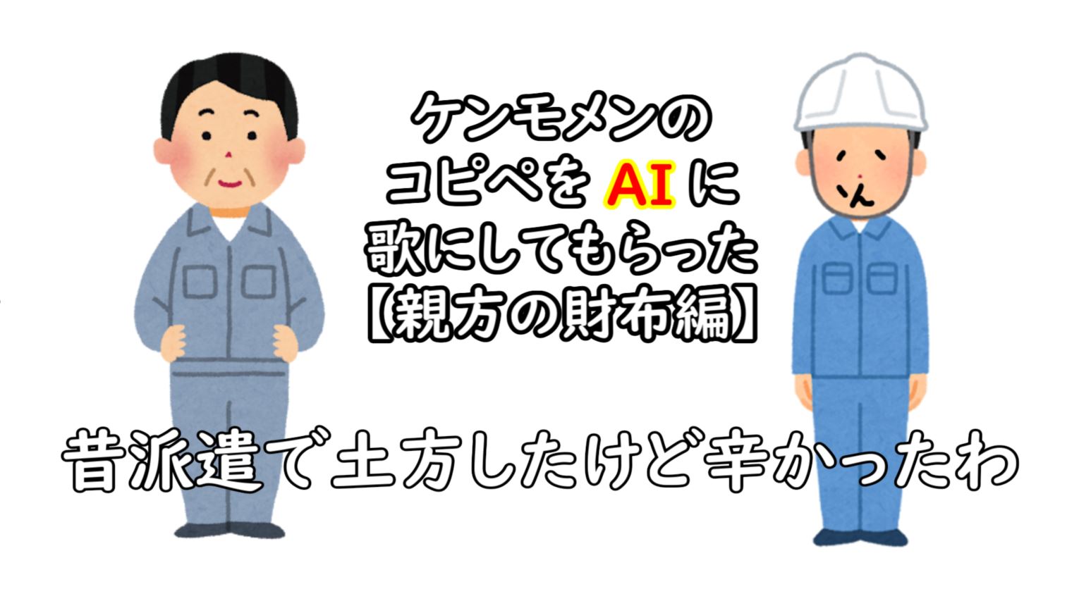 ネットミーム関連の歌シリーズ X Facebook はてブ LINE Pinterest コピー 2025.03.022025.08.11 目次 コピペ【オウフwww】ハルヒオタク【フォカヌポウwww】オレオレ詐欺親方の財布ファイティングポーズグンマープリキュア「謝らないで!」吉野家チャラいコンビニ店員と客「ウィア・・・」嫁のメシがまずい子育て中のワイくんが嫁から受けた暴言ニートの名言(0M0)オンドゥル語(0w0)エルシャダイの有名なセリフあのセクシーな構文伝説の記者会見止まるんじゃねぇぞ全てのスマブラ族に告げるワザップジョルノ止めろめろめろイタチめろ赤犬の敗北者ラップ コピペ 【オウフwww】ハルヒオタク【フォカヌポウwww】 【オウフwww】ハルヒオタクのコピペをAIに歌にしてもらった【フォカヌポウwww】テキストから歌を生成できるAI「Suno」を使って、ハルヒオタクのコピペを歌にしてもらいました。Lyricsオウフwwwいわゆるストレートな質問キタコレですねwwwおっとっとwww拙者『キタコレ』などとついネット用語がwwwまあ拙者の場合ハ... オレオレ詐欺 ( ヽ´ん`)ケンモメンのコピペをAIに歌にしてもらった【オレオレ詐欺編】テキストから歌を生成できるAI「Suno」を使って、ケンモメンのコピペを歌にしてもらいました。今回はオレオレ詐欺編です。Lyrics金に困ってついに自分のバッチャマにオレオレ詐欺したゾ。本物の俺なんだから騙されるに決まってるんだよなあ。10... 親方の財布 ( ヽ´ん`)ケンモメンのコピペをAIに歌にしてもらった【親方の財布編】テキストから歌を生成できるAI「Suno」を使って、ケンモメンのコピペを歌にしてもらいました。今回は親方の財布編です。Lyrics昔派遣で土方したけど辛かったわ。休憩の時に親方から「これでみんなのジュース買ってこい」って財布渡されて耐えられ... ファイティングポーズ ( ヽ´ん`)ケンモメンのコピペをAIに歌にしてもらった【ファイティングポーズ編】テキストから歌を生成できるAI「Suno」を使って、ケンモメンのコピペを歌にしてもらいました。今回はファイティングポーズ編です。Lyrics俺は長期ひきこもりだが真夜中になると部屋でファイティングポーズをとる。自分でも後で笑っちゃうんだが、... グンマー グンマーのコピペをAIに歌にしてもらったテキストから歌を生成できるAI「Suno」を使って、グンマーのコピペをAIに歌にしてもらいました。Lyrics夜中に町をプラプラしてたら警察に捕まった。パトカーが俺のそばに止まって警官が2人出てきて俺を囲んだ。警官「ドゥーユーハヴパスポート... プリキュア「謝らないで!」 プリキュア「謝らないで!」のコピペをAIに歌にしてもらったテキストから歌を生成できるAI「Suno」を使って、プリキュア「謝らないで!」のコピペをAIに歌にしてもらいました。Lyrics上司「はぁぁぁ。これでこのミス何度目??」ワイ「すみ──」プリキュア「(謝らないで!)!」ワイ「!?」プリキュア... 吉野家 吉野家のコピペをAIに歌にしてもらったテキストから歌を生成できるAI「Suno」を使って、吉野家のコピペを歌にしてもらいました。Lyrics昨日、近所の吉野家行ったんです。吉野家。そしたらなんか人がめちゃくちゃいっぱいで座れないんです。で、よく見たらなんか垂れ幕下がってて、15... チャラいコンビニ店員と客「ウィア・・・」 チャラいコンビニ店員と客のコピペ「ウィア・・・」をAIに歌にしてもらったテキストから歌を生成できるAI「Suno」を使って、チャラいコンビニ店員と客のコピペ「ウィア・・・」を歌にしてもらいました。Lyrics客「コレ、オネチィース」店「チス、コレッスネ、ウィッス」客「ウィ」店「……」ピッピ客「オウェ!?ウェ... 嫁のメシがまずい 「嫁のメシがまずい」をAIに歌にしてもらったテキストから歌を生成できるAI「Suno」に嫁のメシがまずいを歌にしてもらいました。Lyrics嫁の料理かああ 食っている凄く不味いそう シャレにならない味だ知ってるか?メシマズ嫁は3つに分けられる不器用な奴味音痴の奴いい加減な奴この3つだ... 子育て中のワイくんが嫁から受けた暴言 「子育て中のワイくんが嫁から受けた暴言」をAIに歌にしてもらったテキストから歌を生成できるAI「Suno」に「子育て中のワイくんが嫁から受けた暴言」を歌にしてもらいました。Lyricsウザいから消えて存在だけでイライラする読み聞かせの仕方が吐き気がする死ね黙れ音痴私が悪いみたいじゃん子育てに参加されると... ニートの名言 ニートの名言をAIに歌にしてもらったテキストから歌を生成できるAI「Suno」にニートの名言を歌にしてもらいました。Lyrics明日から本気出す社会の底辺は俺が守るニートは一日にしてならず働いたら負けかなと思ってる働かなくても食う飯は旨い上を見ることに疲れたら下を見ろ、底には... (0M0)オンドゥル語(0w0) (0M0)オンドゥル語をAIに歌にしてもらった(0w0)テキストから歌を生成できるAI「Suno」にオンドゥル語を歌にしてもらいました。Lyricsオンドゥル語現代語訳ダディヤナザァン!ナジェミデルンディス!?橘さん!なぜ見てるんです!?オンドゥ