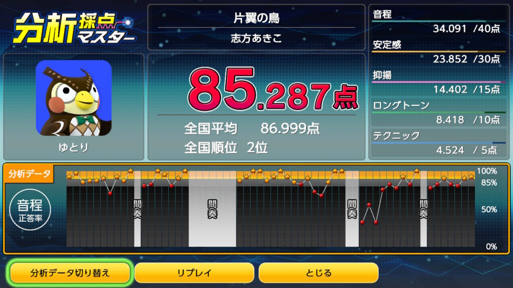 【カラオケ採点】「片翼の鳥」志方あきこ 85.287点