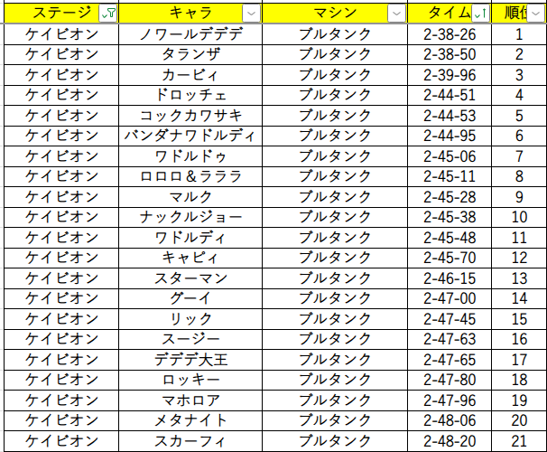以上より、ケイビオンの場合、一番速かったのはノワールデデデ&ブルタンク、一番遅かったのはスカーフィ&ペーパースターで、ダートを突っ切っても減速しないかどうかが最もタイムに影響しているという結果になりました。