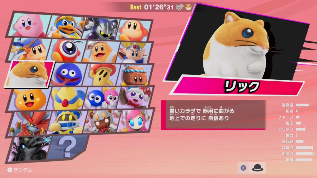 カービィで一番速く走れたのはレックスウィリー、一番遅かったのはウイングスターでした。