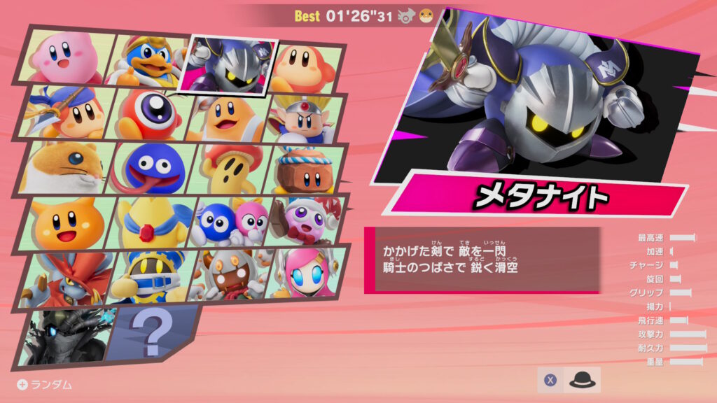 よって、フラリアを一番速く走れるのはリック&レックスウィリー、一番遅いのはメタナイト&ウイングスターという結果になりました。