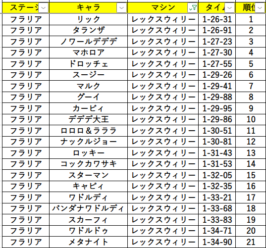レックスウィリーでのキャラごとのタイムは以下の通りになりました。