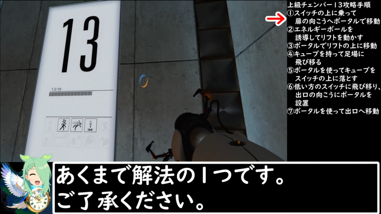 【ずんだもん解説】上級チェンバー13の攻略方法【PORTAL】 ゲーム・動画編集 X Facebook はてブ LINE Pinterest コピー 2026.03.17 攻略チャート ①スイッチの上に乗って扉の向こうへポータルで移動②エネルギーボールを誘導してリフトを動かす③ポータルでリフトの上に移動④キューブを持って足場に飛び移る⑤ポータルを使ってキューブをスイッチの上に落とす⑥低い方のスイッチに飛び移り、出口の向こうにポータルを設置⑦ポータルを使って出口へ移動