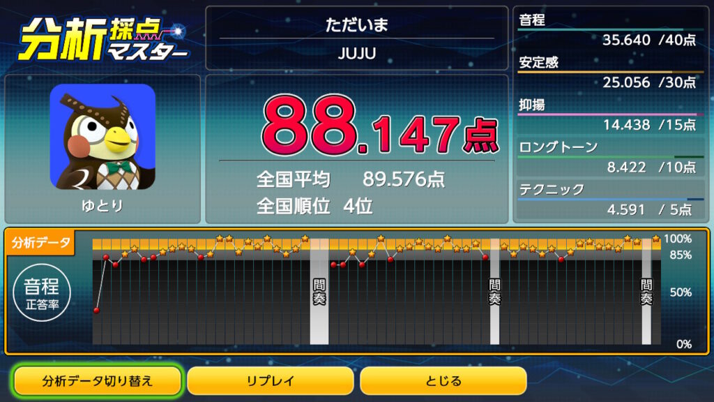 今回、任天堂switchのJOYSOUNDカラオケで採点してみたのは、JUJUの「ただいま」です。
